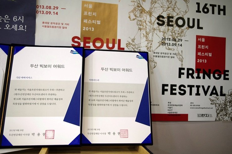 제 1회 두산 빅보이 어워드에 ‘극단 바바서커스’, ‘이파리드리’가 선정되었습니다. 올해로 16회를 맞은 서울프린지페스티벌에 참가한 106개 팀 중 73개 팀의 실연심사를 진행하여 총 2개 팀을 선정하였습니다. 수상자에게는 상금 각 2백 만원과 2014년 두산아트랩 참가 기회가 제공됩니다.