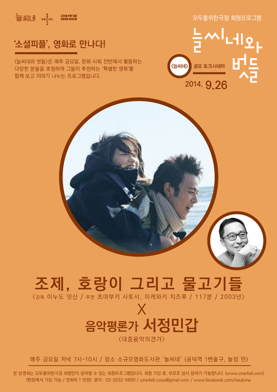 9월의 마지막 게스트는 한국대중음악상 선정위원으로 활동하고 있는 '음악평론가 서정민갑'님입니다. 추천작 <조제, 호랑이 그리고 물고기들>은 일본의 느낌이 물씬 묻어나는 독특하면서도 새로운 느낌의 러브스토리입니다. 서정적인 가을 밤과 어울리는 '서정민갑'님과 함께 조제, 그녀를 다시 추억하고 싶다면 금요일 저녁 늘씨네에서 만나요.