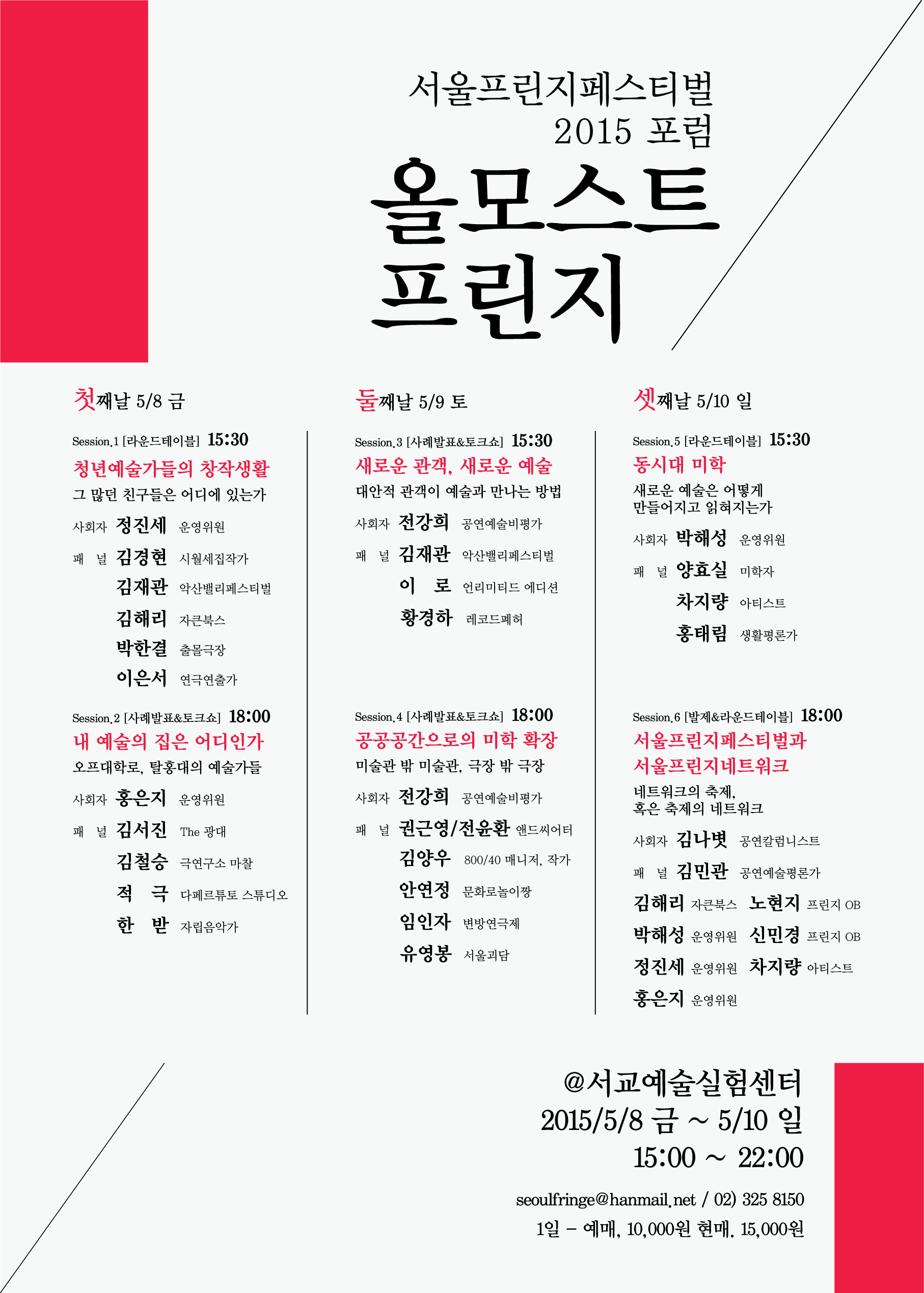 자세한 포럼 정보는 서울프린지네트워크 공식홈페이지(www.seoulfringe.net), 공식 페이스북(www.facebook.com/seoulfringe) 에서 확인 가능하며, 현재 사전 참가신청을 받고 있습니다.