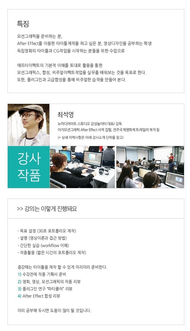 영상디자인을 공부하는 학생, 독립영화의 타이틀과 CG작업을 시작하는 분들을 위한 수업으로