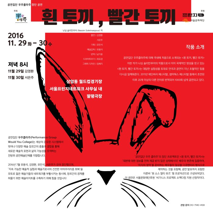 공연집단 우주콜라주 창단 공연 <흰 토끼, 빨간토끼>가 서울프린지네트워크 내 팔평극장에서 11월 29~30일(8~9시) 양일간 공연합니다.