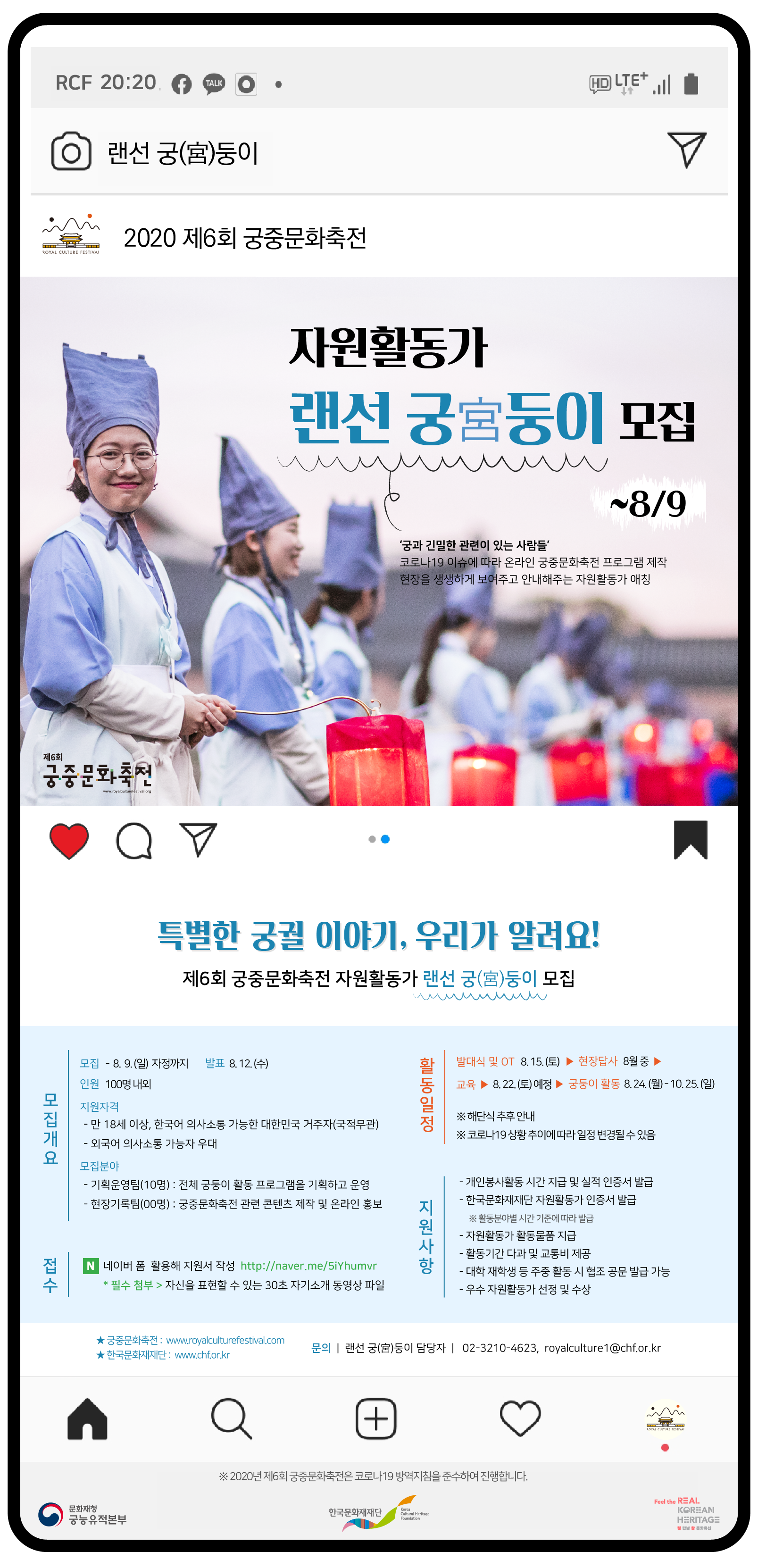 방역지침을 준수하며 궁 곳곳을 누비면서 시민들의 눈과 귀가 되어줄, 온라인 축전을 함께 만들어 갈 적극적이고 열정 가득한 여러분의 많은 참여를 기다립니다.