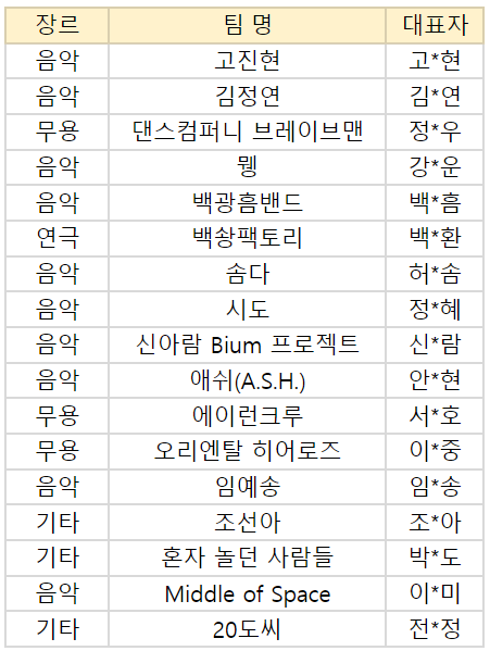 이번 심의로 선정된 총 17팀과 전년도 연속지원 예술가로 함께하게 된 4팀의 명단을 아래에서 확인해주시기 바랍니다.