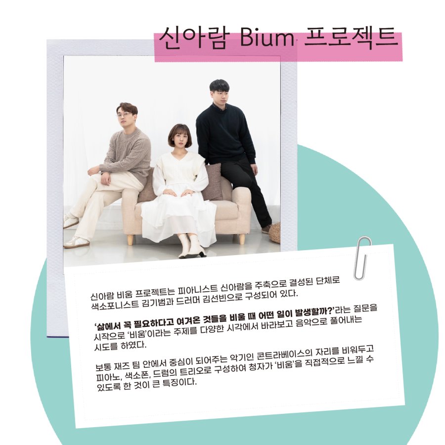신아람 비움 프로젝트는 피아니스트 신아람을 주축으로 결성된 단체로 색소포니스트 김기범과 드러머 김선빈으로 구성되어 있다. ‘삶에서 꼭 필요하다고 여겨온 것들을 비울 때 어떤 일이 발생할까?’라는 질문을 시작으로 ‘비움’이라는 주제를 다양한 시각에서 바라보고 음악으로 풀어내는 시도를 하였다. 보통 재즈 팀 안에서 중심이 되어주는 악기인 콘트라베이스의 자리를 비워두고 피아노, 색소폰, 드럼의 트리오로 구성하여 청자가 ‘비움’을 직접적으로 느낄 수 있도록 한 것이 큰 특징이다.