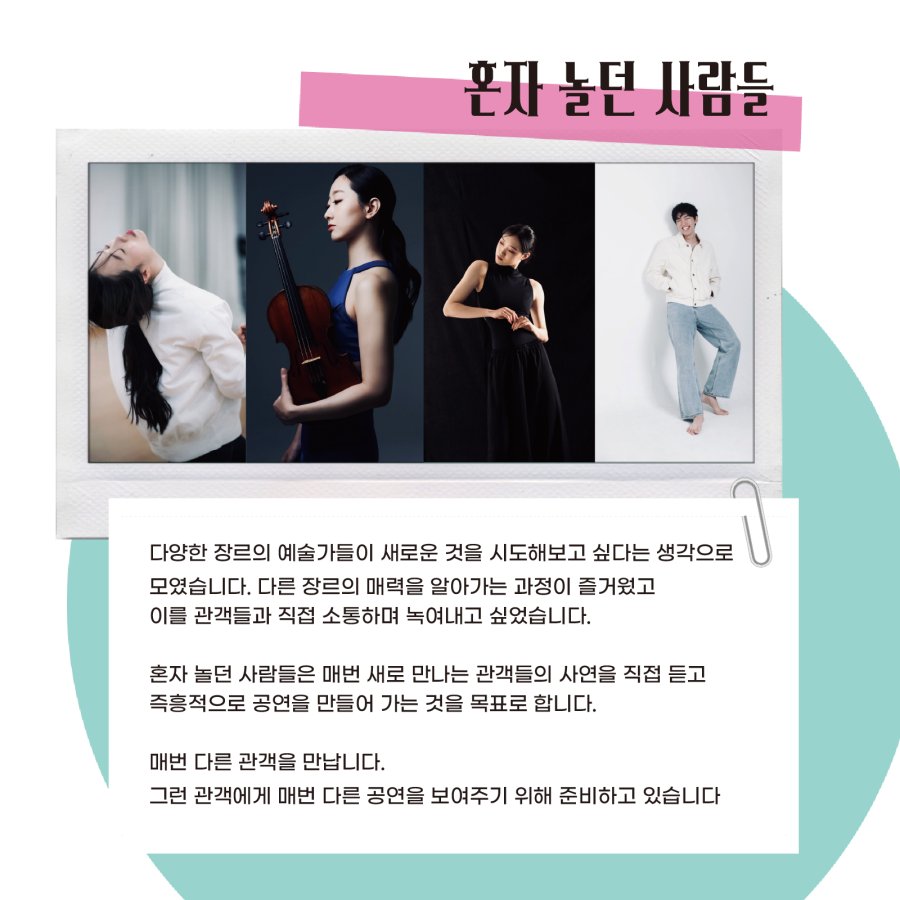 다양한 장르의 예술가들이 새로운 것을 시도해보고 싶다는 생각으로 모였습니다. 다른 장르의 매력을 알아가는 과정이 즐거웠고 이를 관객들과 직접 소통하며 녹여내고 싶었습니다. 혼자 놀던 사람들은 매번 새로 만나는 관객들의 사연을 직접 듣고 즉흥적으로 공연을 만들어가는 것을 목표로 합니다. 매번 다른 관객을 만납니다. 그런 관객에게 매번 다른 공연을 보여주기 위해 준비하고 있습니다.