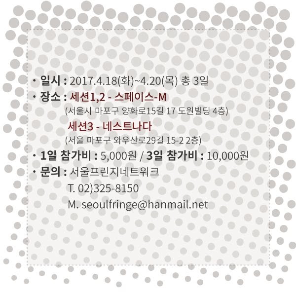 서울프린지페스티벌2017의 시작을 알리는 <올모스트프린지> 포럼이 4월 18일(화)부터 4월 20일(목)까지 진행되었습니다.