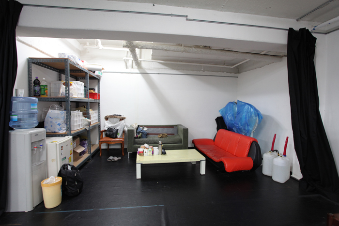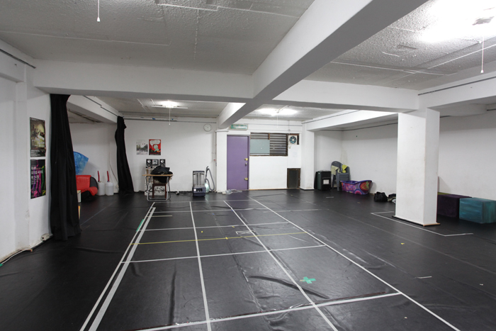 규모 : 30평ㆍ 마루바닥(검은 고무판)ㆍ 흰벽ㆍ 검정색 커튼ㆍ 오디오ㆍ 정수기ㆍ 냉장고ㆍ 수납장