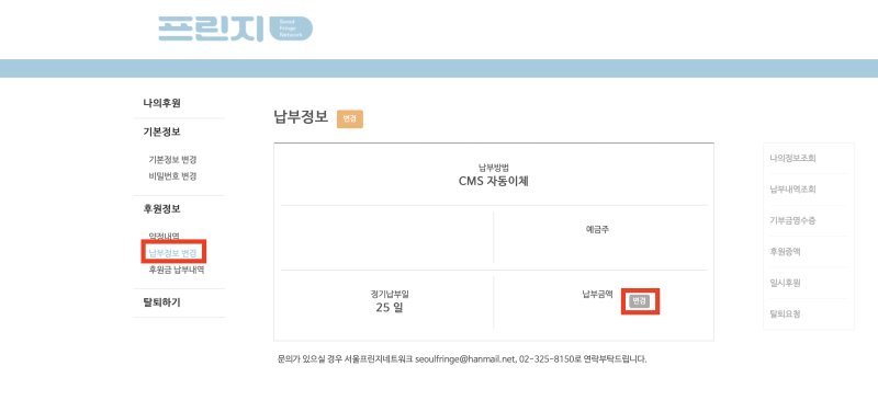 납부정보 변경에서 납부금액 변경 버튼을 클릭하시면 후원 금액을 변경하실 수 있습니다.