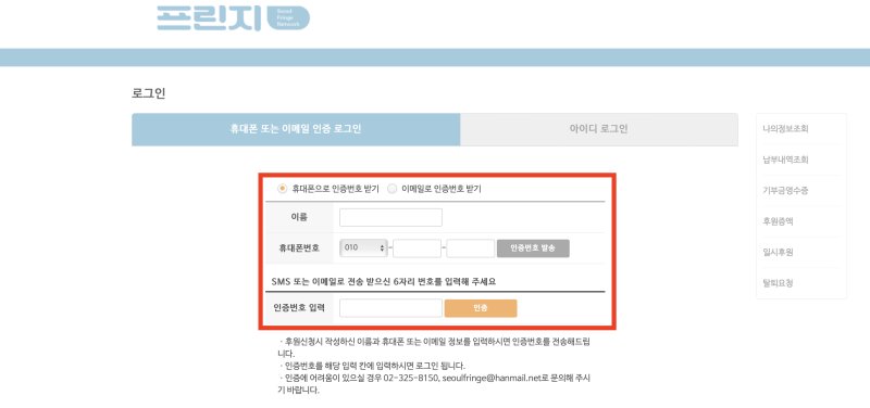 서울프린지네트워크 홈페이지 후원하기 > 나의 후원정보에서 후원신청시 작성하신 이름과 휴대폰 또는 이메일 정보를 입력해 인증을 받으시면,
